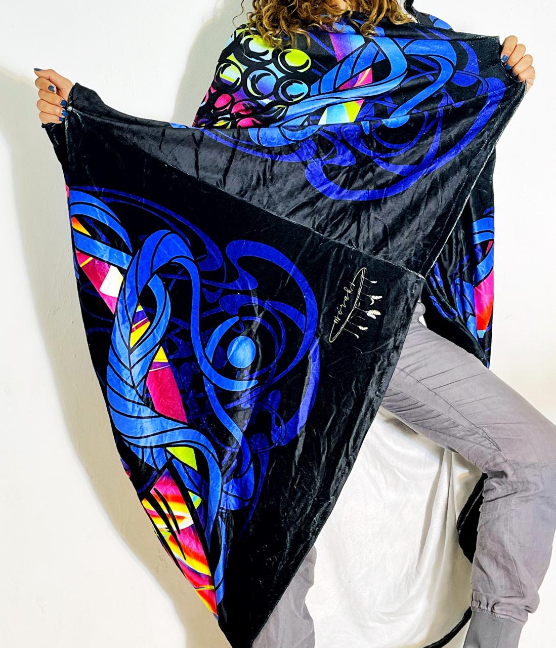 The inside of the our wearable blanket is crafted with Ultra-Soft Plush. The outside is crafted with Micro-Mink Polyester that allows us to print high definition art with intense vivid colors. completely made by hand with love.